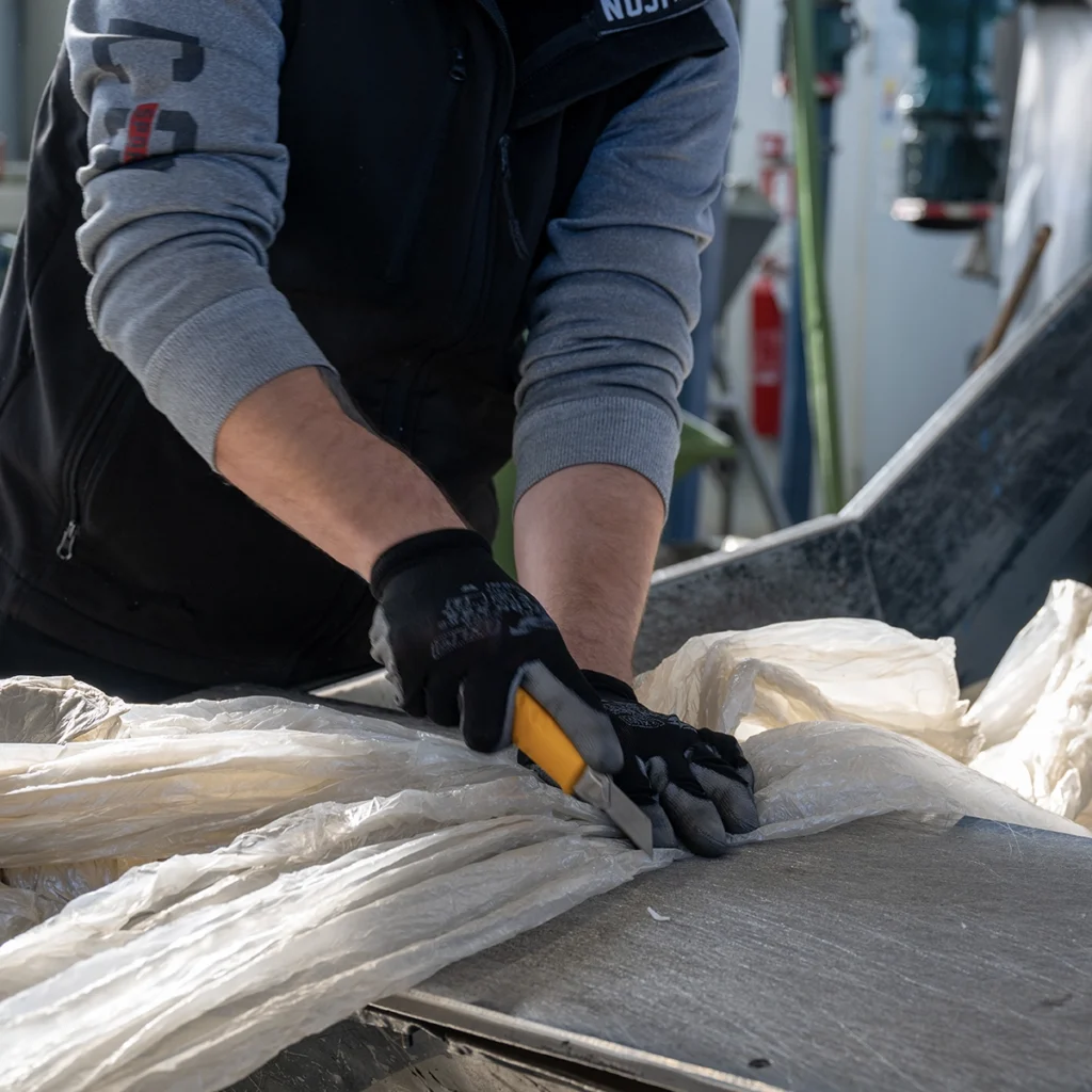Gestiamo internamente ogni fase della rigenerazione: selezione, estrusione, controllo qualità e confezionamento.